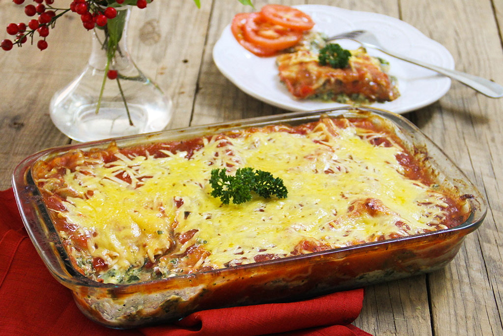 An easy and delicious meat free lasagna filled with Nuveg spinach topped with a tomato sauce mixture and cheddar cheese. Serves up to 6 persons.