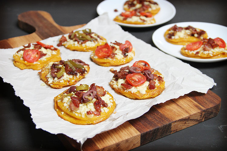 Tasty Nuveg pre-cooked pumpkin fritters, with your desired pizza topping, perfect as a meal, or as bite-size snacks. Kids will love them!